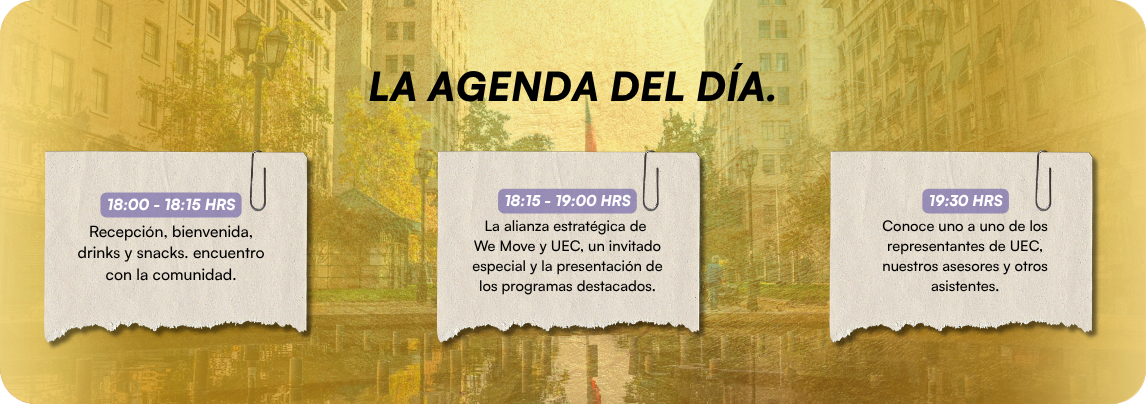 19:00 - 19:30 hrs | El "Golden Ticket" de UEC: El momento más esperado de la noche. Revelaremos oportunidades exclusivas y descuentos únicamente para quienes asistan al evento.